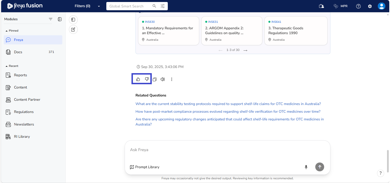 Your input plays a vital role in helping us refine and improve Freya. After each response, you will find a thumbs up 👍 or thumbs down 👎 icon at the bottom of the screen: