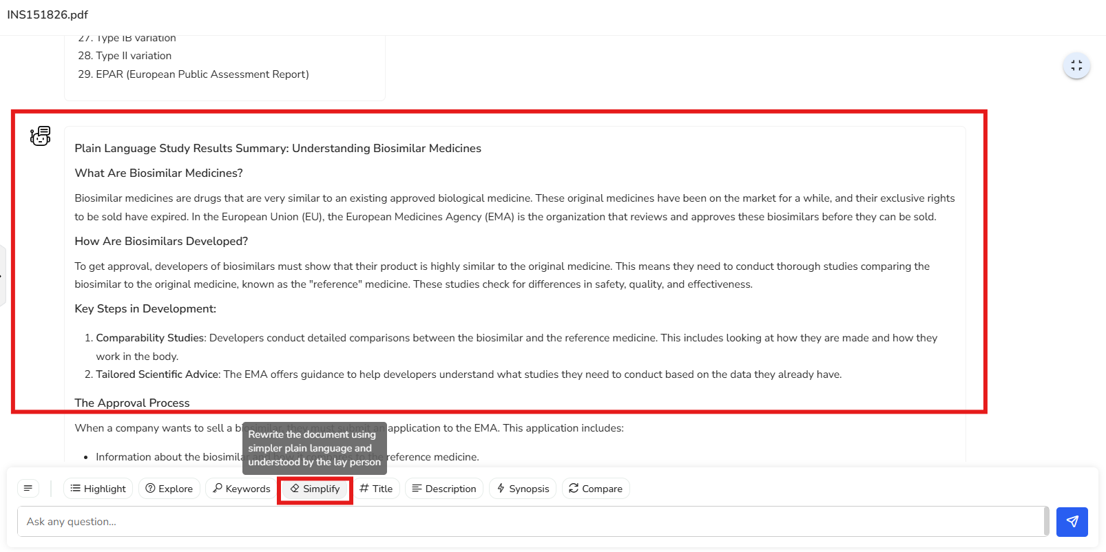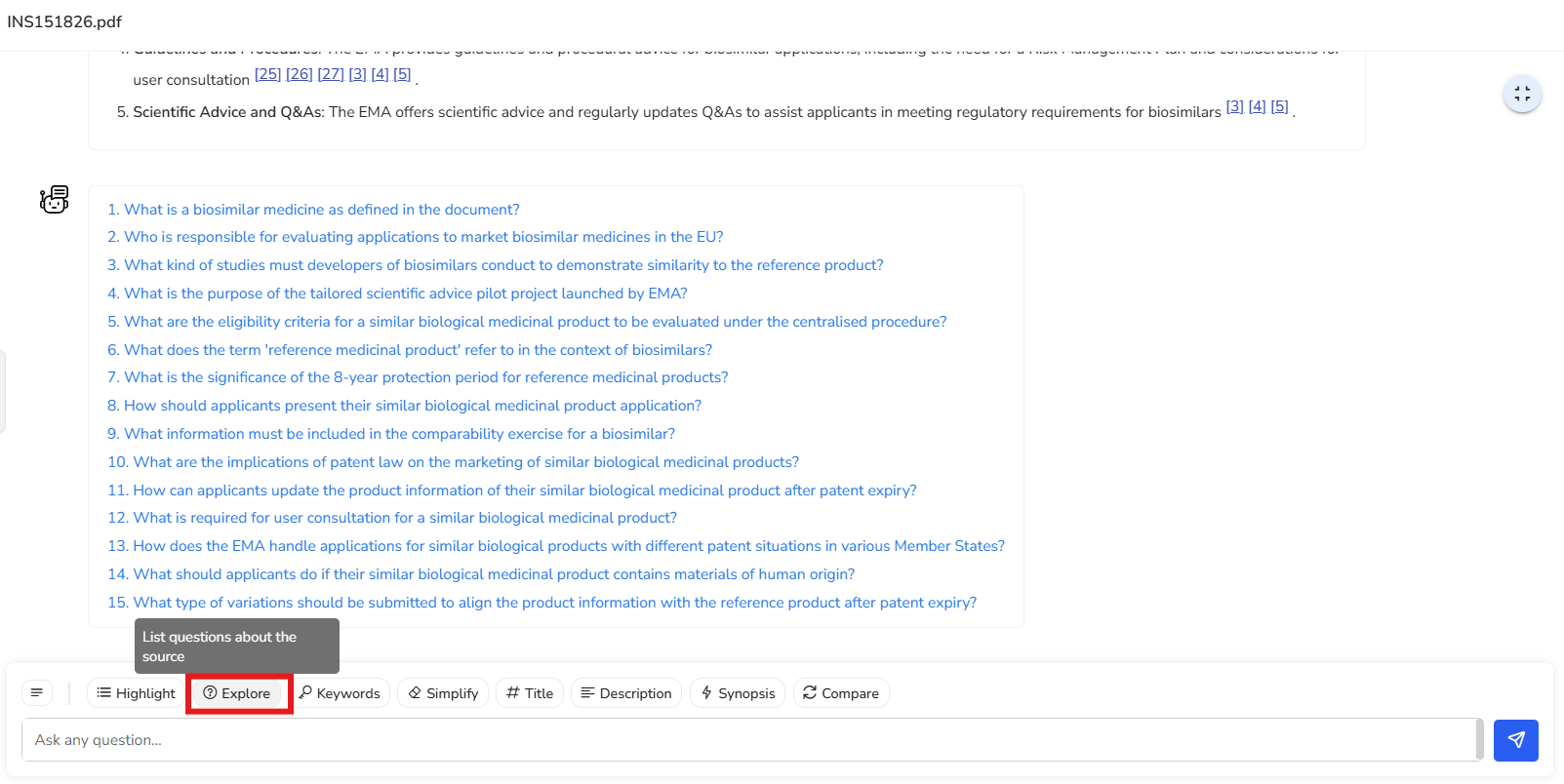 In this example, a list of 29 key keywords has been extracted from the document. These keywords provide a quick overview of the main themes and topics covered. Terms like “compatibility exercise,” “reference medicinal product,” and “EMA (European Medicines Agency)” help you grasp the document’s core focus at a glance.