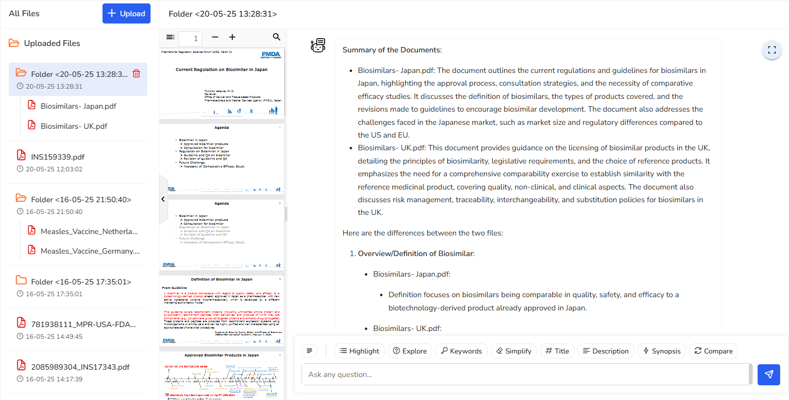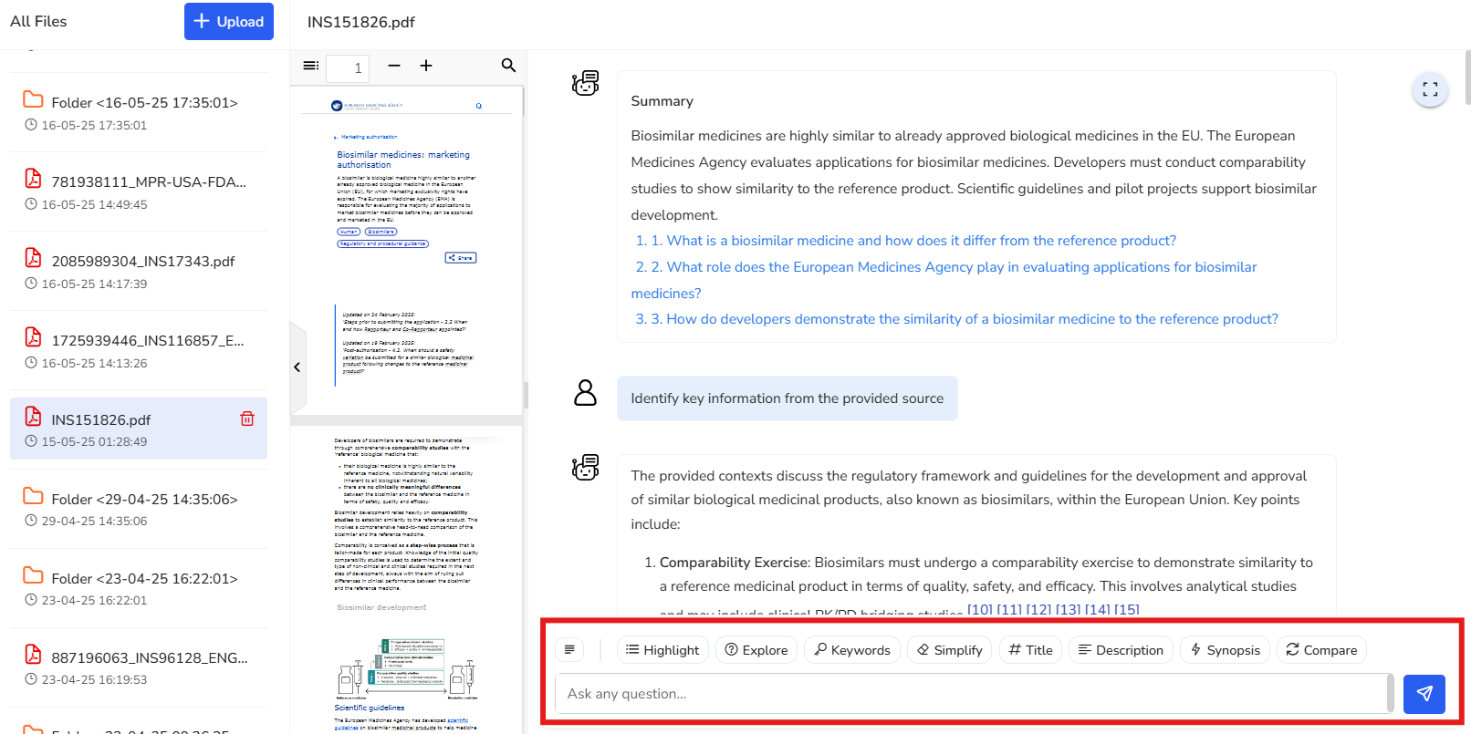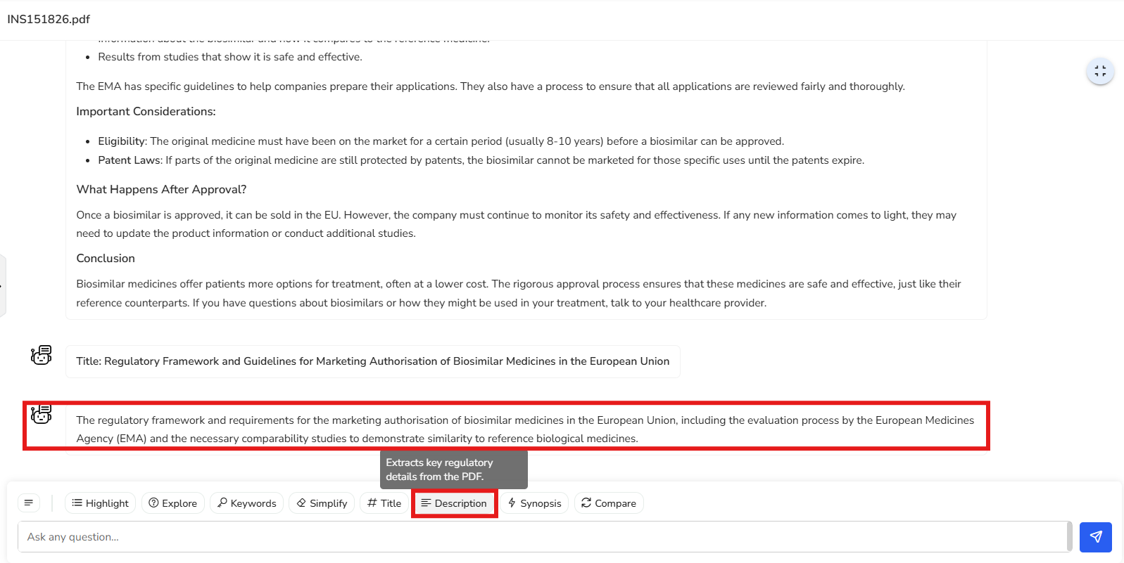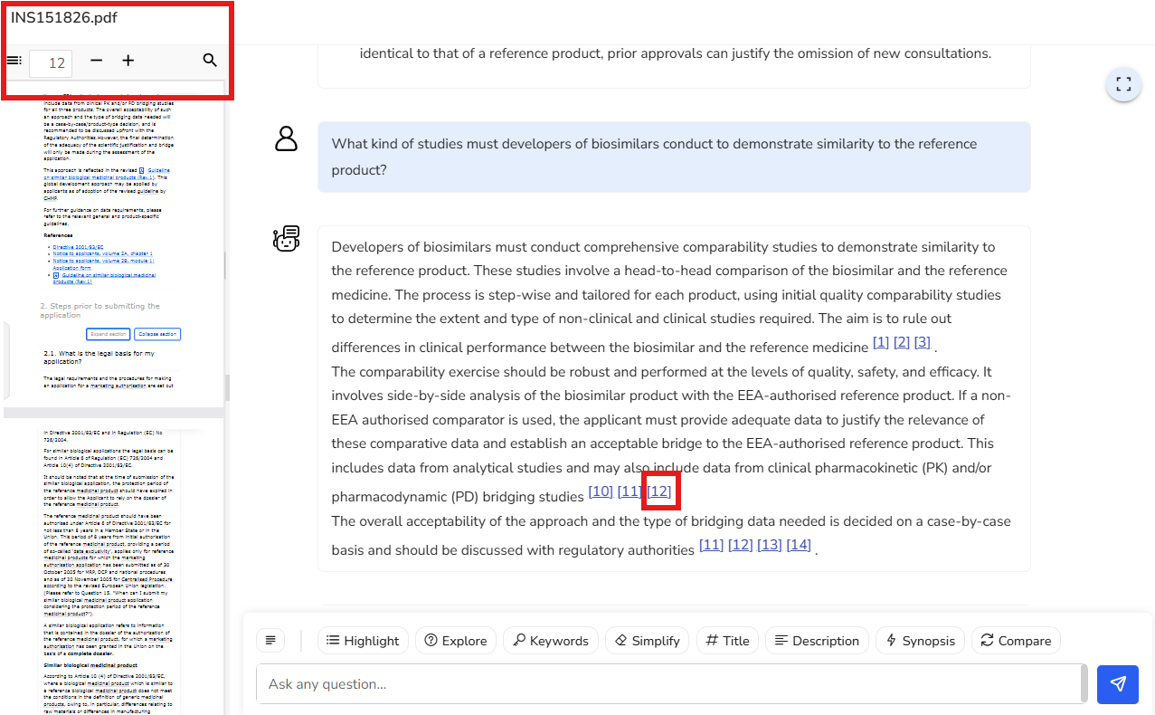 In this example, we’ve selected a regulation that outlines the regulatory framework and guidelines for the development and approval of biosimilars within the European Union. Key points from the document are highlighted here, along with the corresponding reference pages for easy navigation and deeper exploration.