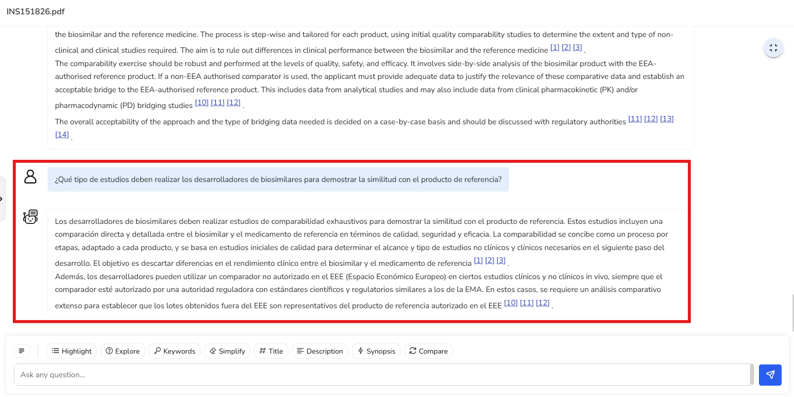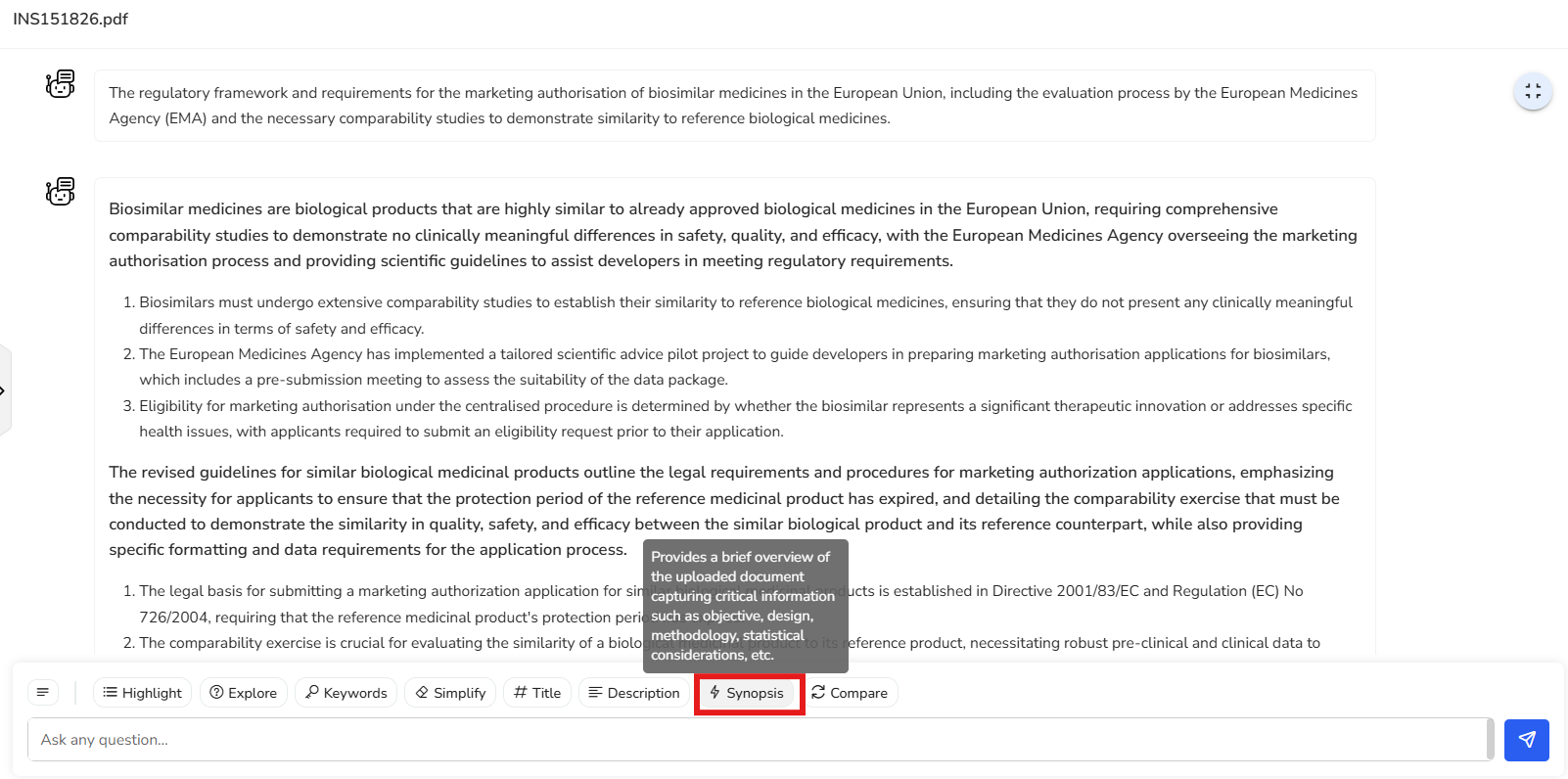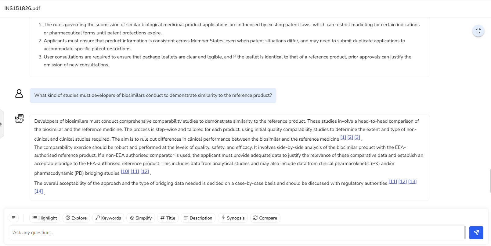 Let’s go ahead and select the third question from the list. We get a clear response about the comparability studies to be conducted on biosimilars to demonstrate similarity with their reference product.