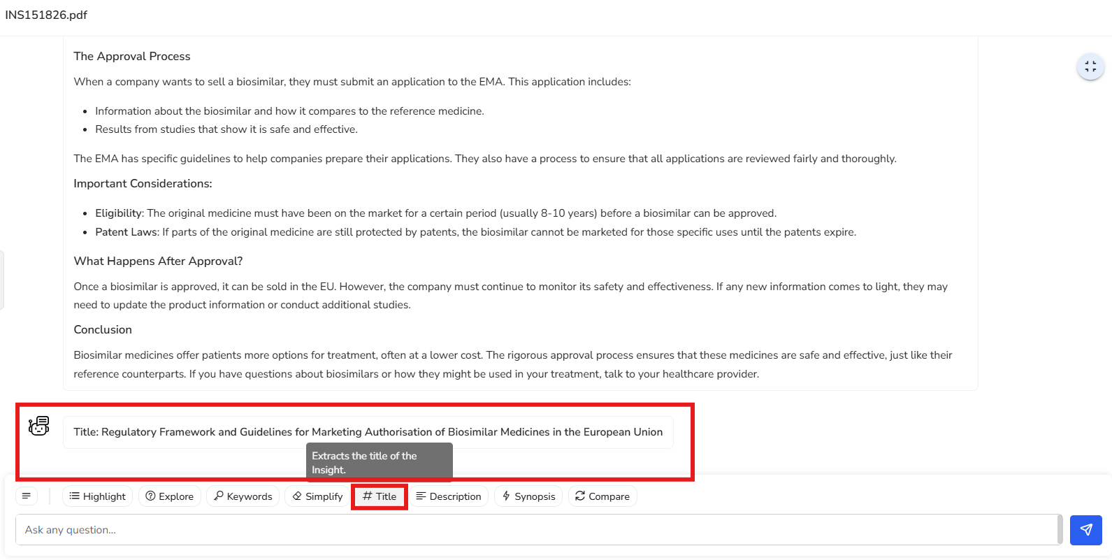 Automatically suggests a clear and relevant title for the insights extracted from your document, helping you stay organized.