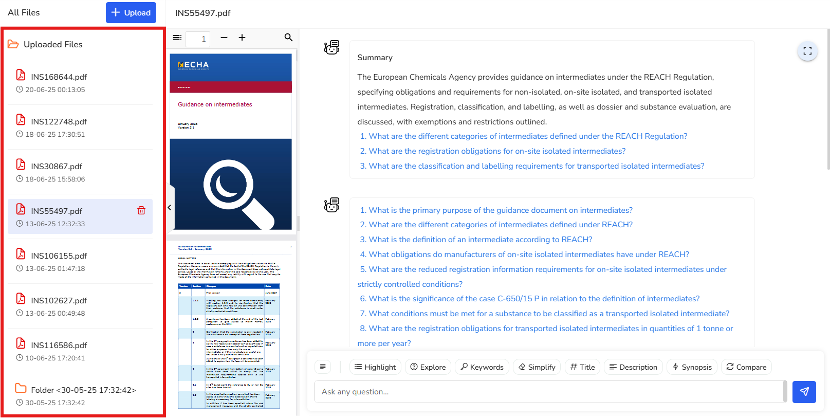 - As soon as your document is uploaded, you’ll receive a concise summary of its key points—making it easy to grasp the content at a glance. To help you get started, suggested questions are provided, or you can ask your own questions. The more specific your questions, the more accurate and relevant your answers will be.
