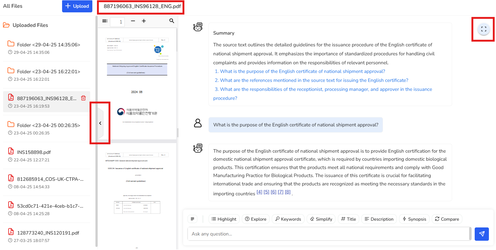 - To reduce distractions and keep your workspace clear, you can collapse both the uploaded documents panel and the PDF preview by clicking the corner brackets icon. This lets you concentrate fully on the chat and insights.